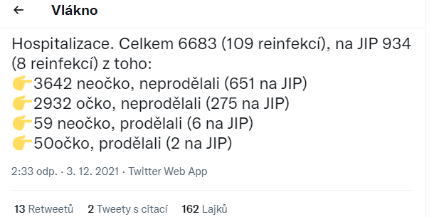 První obrázek je screen z twitterového příspěvku JUDr. Dostála, což je specialista na zdravotnické právo za Piráty. Paradoxem je, že mnoha voliči a straníky je vnímán dosti negativně, protože způsobu interpretace jeho dat využívají různé antivaxerské spolky. Samotná data, která by měla být původem z ÚZIS, se nicméně zdají v pořádku a já je považuji za dosti cenná. Víme díky nim, kolik očkovaných / neočkovaných / promořených / nepromořených je aktuálně hospitalizováno.