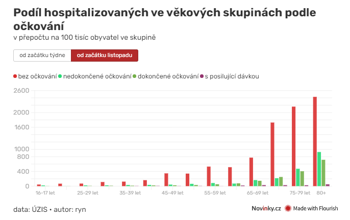 Druhý obrázek je graf, kde vidíme počty hospitalizovaných za listopad 2021 na 100,000 obyvatel rozdělených podle věku a očkování včetně posilujících dávek.