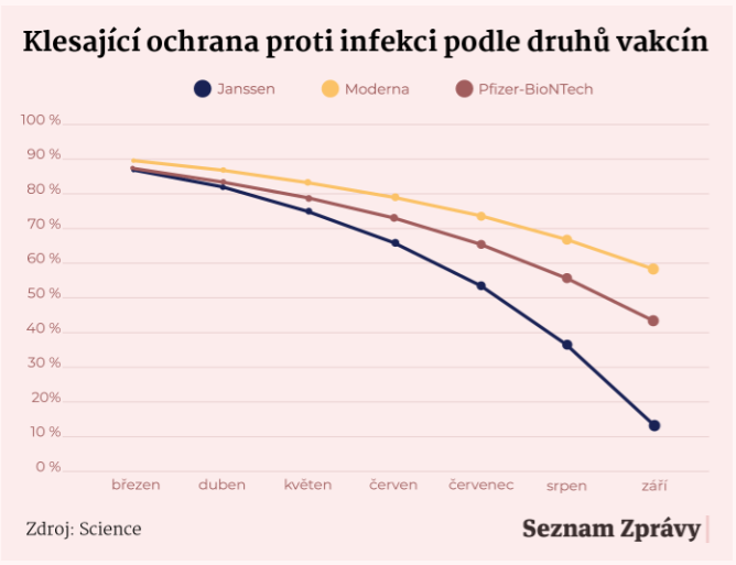 Třetí obrázek ukazuje odhadovaný pokles efektivity různých vakcín v čase. Dodávám, že efektivita v tomto případě znamená míru ochrany vůči nákaze.